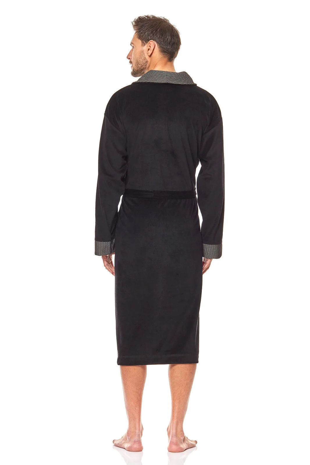 Pánský velurový župan se šálovým límcem. Župan je dlouhý a v pase se zavazuje. Na úrovni boků jsou dvě kapsy. Manžety, límec a kapsy zdobí vzorovaná látka. Na hrudníku je ozdobná aplikace. Složení: 80 % bavlna, 20 % polyester.