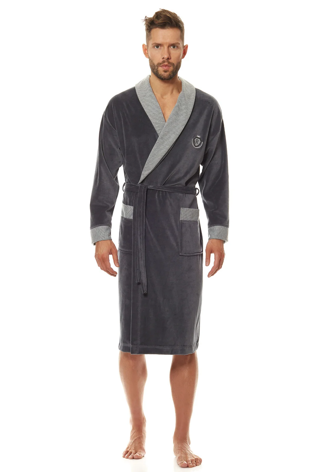Pánský velurový župan se šálovým límcem. Župan je dlouhý a v pase se zavazuje. Na úrovni boků jsou dvě kapsy. Manžety, límec a kapsy zdobí vzorovaná látka. Na hrudníku je ozdobná aplikace. Složení: 80 % bavlna, 20 % polyester.