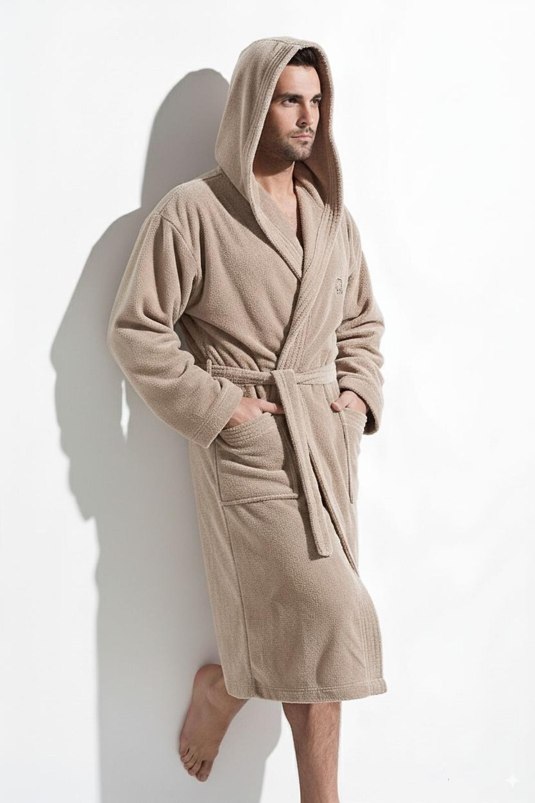 Pánský župan s kapucí. Župan je vyrobený z měkké látky (soft), na bocích má vnější kapsy a zavazuje se v pase. Na úrovni hrudníku je našitá aplikace. Župan je měkký a příjemný na dotyk a při nošení je velmi pohodlný a komfortní.