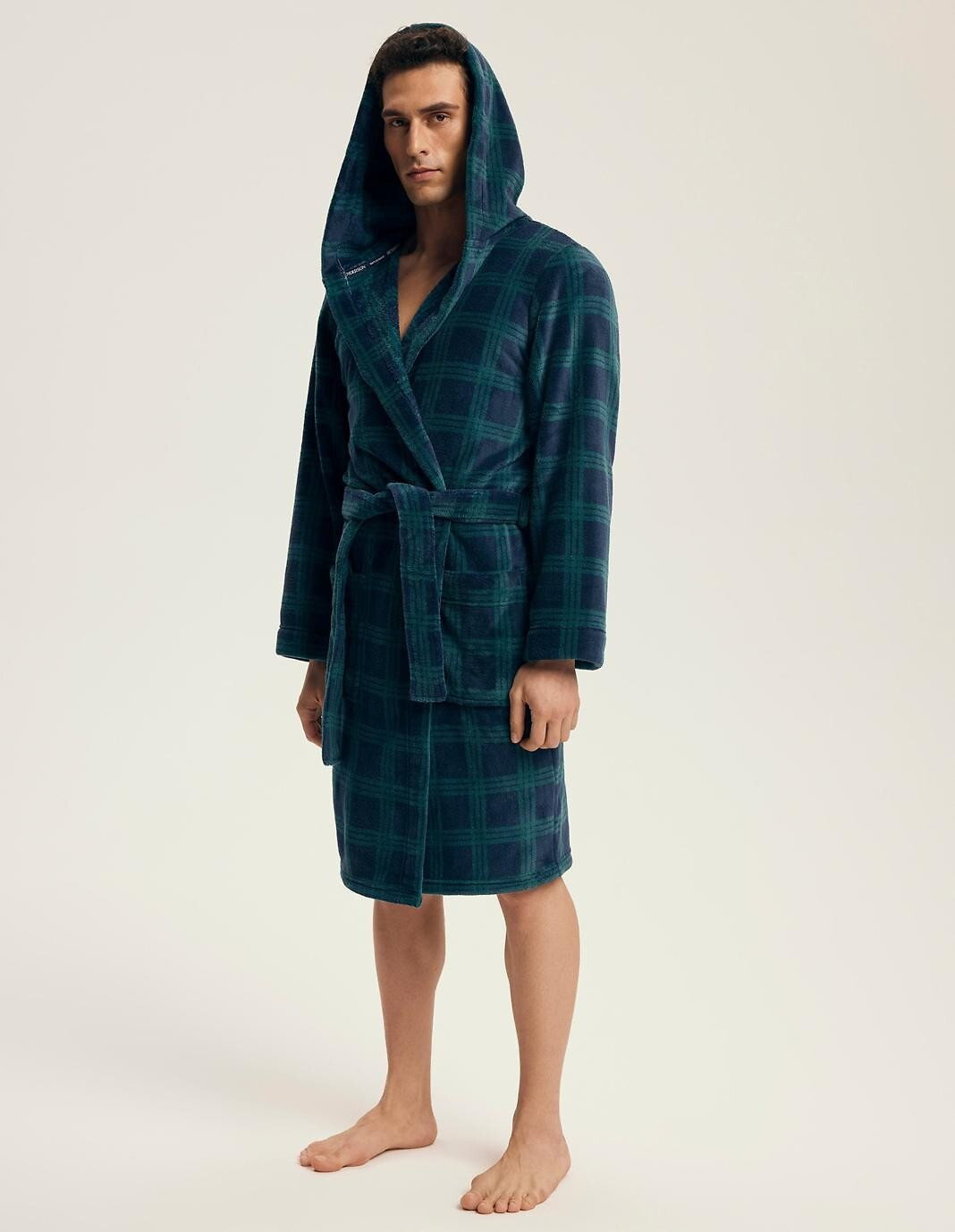 Pánský župan s kapucí - příjemný, měkký, teplý úplet - kostkovaný vzor - zavazování v pase - pohodlné kapsy s nášivkami na bocích Složení: 100% polyester