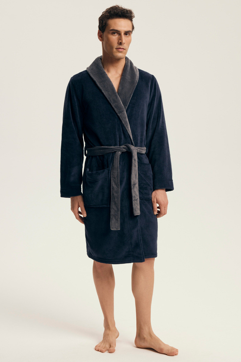 Szlafrok męski NOCTURN 43378 AW25 – klasyczna elegancja w domowym wydaniu Szlafrok męski NOCTURN 43378 AW25 to połączenie klasycznego fasonu z wyjątkowym komfortem noszenia. Wykonany z miękkiego, przyjemnego w dotyku materiału, idealnie sprawdza się na chłodne poranki, wieczory lub po kąpieli. Kontrastowy kołnierz w ciemniejszym odcieniu dodaje mu stylowego charakteru. Duże kieszenie oraz praktyczne wiązanie w pasie zapewniają wygodę i funkcjonalność na co dzień. Głęboki granatowy kolor sprawia, że szlafrok prezentuje się bardzo elegancko i ponadczasowo. Skład surowcowy: 100% Poliester