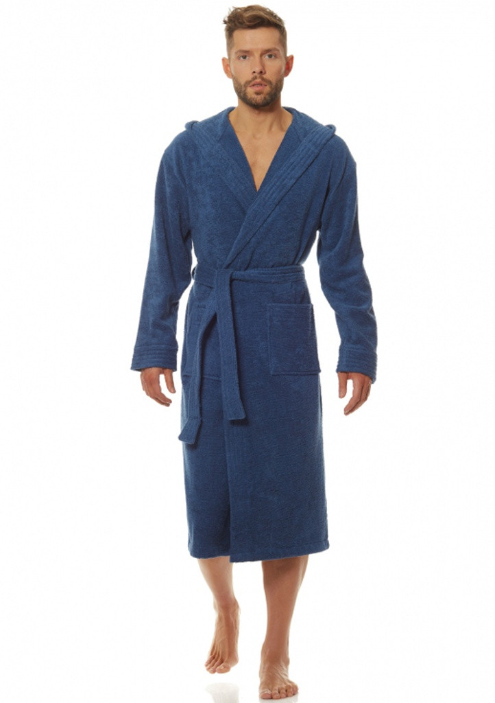 Dlouhý pánský župan s kapucí. Župan je vyrobený z měkké froté tkaniny a v pase se zavazuje. Na bocích jsou vnějších kapsy. Model je měkký a příjemný na dotyk a při nošení je pohodlný a komfortní. Materiálové složení: 100% bavlna.