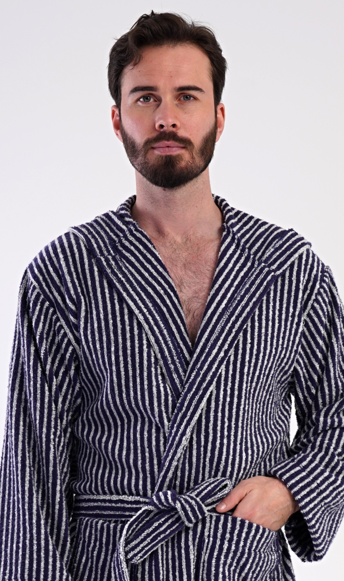 Pánský bavlněný froté župan s kapucí Proužek. Pánský dlouhý župan s kapucí a páskem ke stažení je vhodný po koupeli i na povalování se doma na gauči. Froté župan má praktické kapsy, které oceníte při návštěvě wellness. Použitý bavlněný materiál je příjemný a poddajný na dotek. Pokyny pro údržbu: - 100% bavlna - lze prát v pračce při teplotě do 30° - nesušit v sušičce - žehlit z rubu do 110° - nepoužívat bělící prostředky - nečistit chemicky Míry naměřené na výrobku: 617530000 Proužek L XL XXL obvod hrudníku 120 124 126 délka županu 118 120 120 délka rukávu (od ramene) 54 56 58