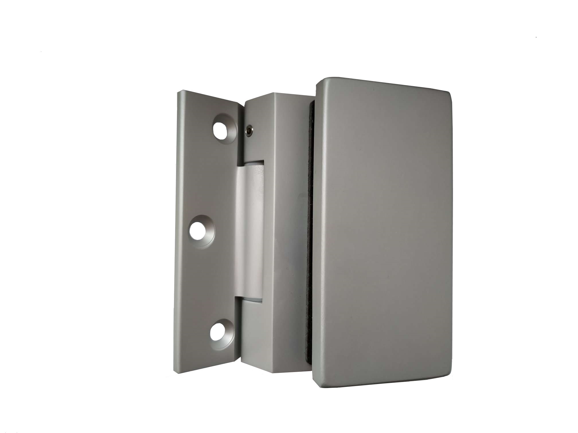 Hliníkový stříbrný pant určený pro tloušťku skla 8mm/10mm/12mm. Vrtání: 2x 16mm, rozteč 45mm, 28mm od hrany skla.