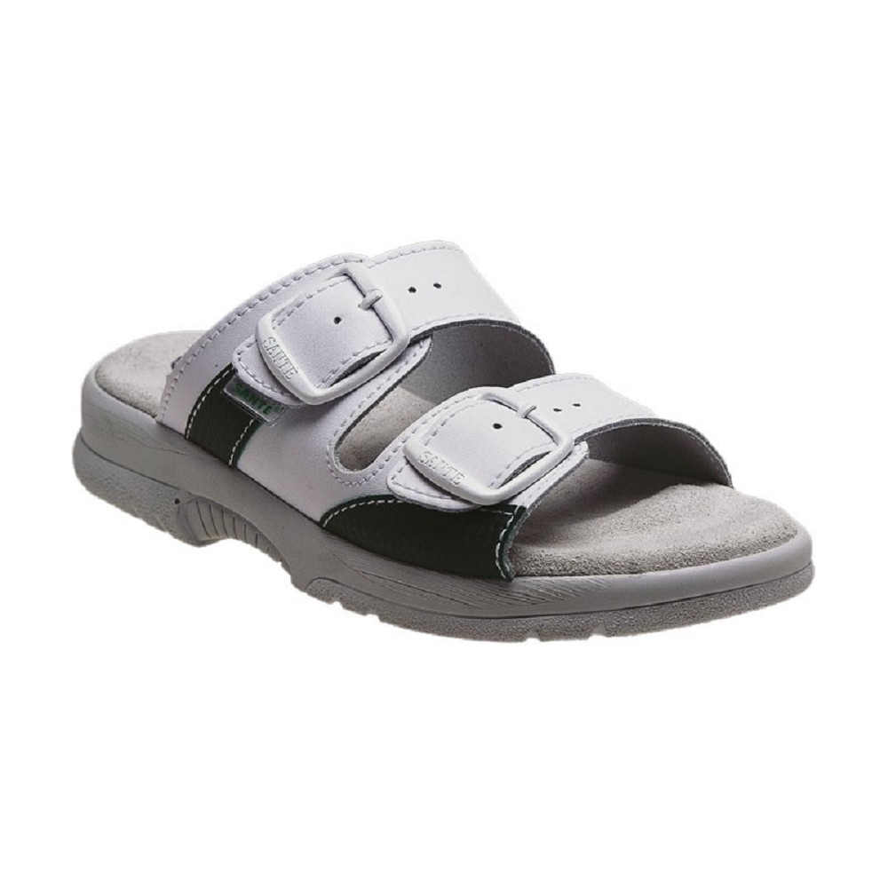 Pantofle dámské SANTÉ Anatomicky tvarovaná stélka podepírá příčnou i podélnou klenbu, čímž zabraňuje vzniku ploché nohy. Pantofle značky SANTÉ jsou velmi pohodlné a dodávají noze potřebný komfort i při dlouhodobém nošení. Jsou určeny jako pracovní, domácí či vycházková letní obuv. Vrchový materiál useň (kůže), tvarovaná stélka, nastavitelné zapínání na 2 přezky. CERTIFIKOVANÁ OBUV. K výrobě obuvi jsou používány jak české materiály, které splňují vysoké nároky pro výrobu, tak i komponenty ze zemí Evropské Unie. Tím jsou splněny vysoké požadavky na kvalitu obuvi, kterou naši zákazníci požadují a zcela jistě ocení. Velikosti 36, 37, 38, 39, 40, 41 Barva: bílá/zelená,
