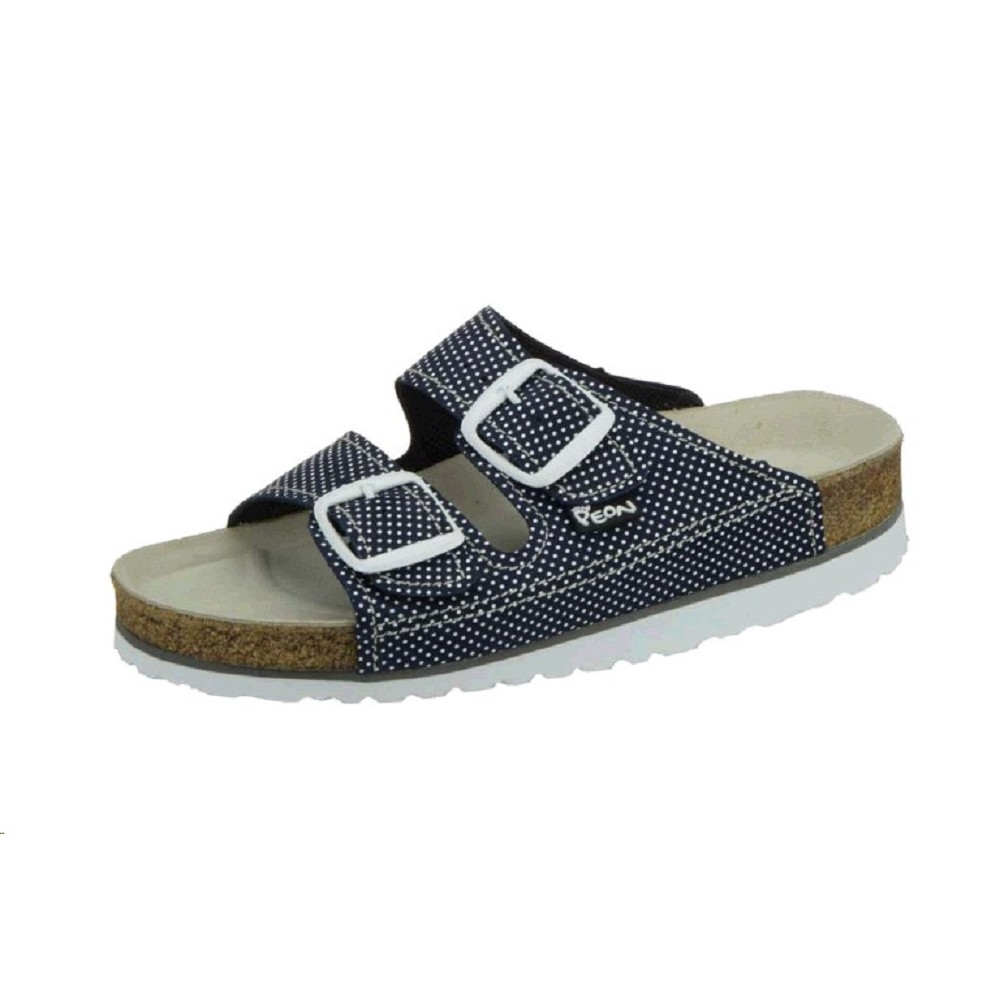 Pantofle PEON PE/125K-35 dámské černé s puntíky Detailní popis produktuDámské odlehčené pantofle na nízkém klínku s korkovou mezipodešví a mechovkou tlumící otřesy při chůzi. Dámské pantofle v moderním stylu se dvěma pásky s kovovými sponami umožňujícími přizpůsobení velikosti. Ortopedicky tvarované stélka potažená přírodní kůží a odlehčená podešev odolná proti uklouznutí Vám zajistí zdravé a pohodlné obutí na doma i do práce.