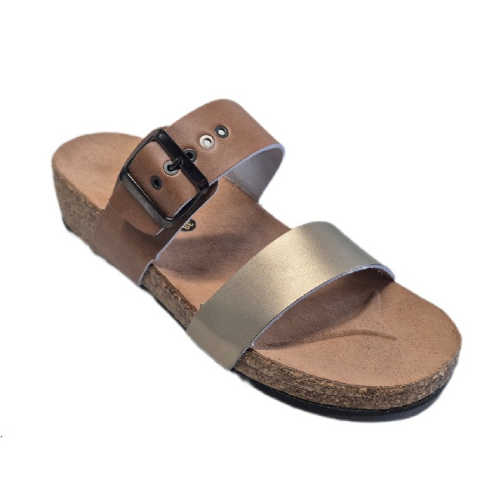 Pantofle PEON PE/31-8Z dámské hnědo-zlaté Korkové pantofle pro Vás vyrábíme v malých sériích v České republice. Dámské pantofle na nízkém klínku s korkovou mezipodešví a mechovkou tlumící otřesy při chůzi. Dámské pantofle v moderním stylu se dvěma pásky, z nichž jeden je s kovovou sponou umožňujícími přizpůsobení velikosti. Ortopedicky tvarovaná stélka potažená přírodní kůží pro zdravé a pohodlné vycházky do práce i do města. Výška podpatku 3.5 cm Určení obuvi Vycházková Svrchní materiál Kůže Vnitřní materiál Kůže Velikosti 37-41 Barva hnědo-zlaté