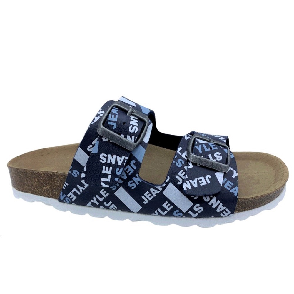 Pantofle REGA I044 dámské modré Dámské moderní pantofle hezkého vzhledu rovné s nápisem jeans style měkčená kožená stélká s ortopedickými prvky pro pohodlnější došlap, nechybí podprstová řasa. vrchní materiál syntetika zapínání na 2 pásky s přezkou. Pásky nastavitelné 4 dírkami Barva modrá Velikosti 36-42