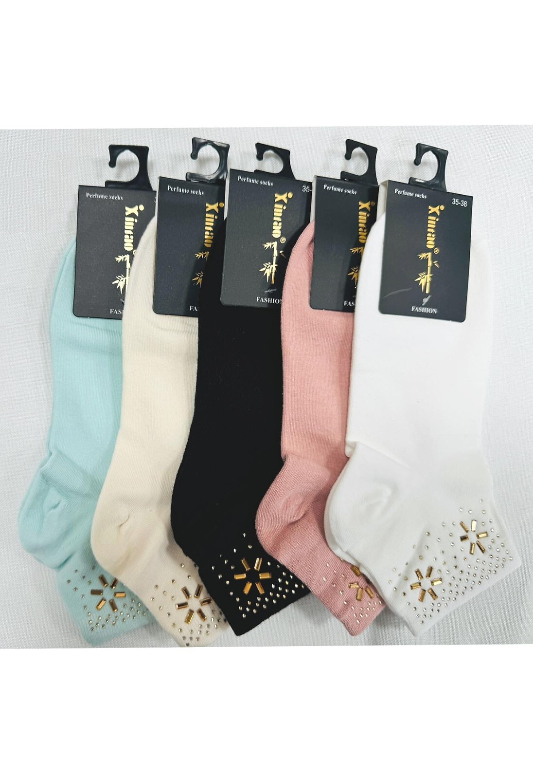 Dámské měkké ponožky - s příchutí - z bambusového vlákna - netlačící lem zdobený vzorem zirkonů a lesklých kamínků Složení: 95 % bambus, 5 % spandex