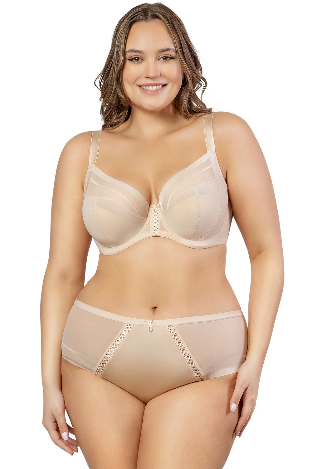 Podprsenka značky Parfait, model P6062. svislé kostice na bocích. nastavitelná ramínka, neodepínatelná. zapínání na háčky. místo zapínání: na zádech. dvě řady svislých háčků. tři úrovně vodorovných háčků. výrobek je vyroben z 58 % polyamidu, 42 % spandexu. dámské oblečení. boky vyztužené látkou. bezešvé okraje.