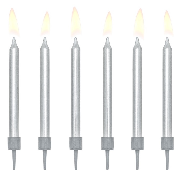 Svíčky pro ozdobu každého dortu či sladkého dezertu. Výška svíčky je 6 cm. Balení obsahuje 6 ks svíček a také 6 ks plastových držáků.