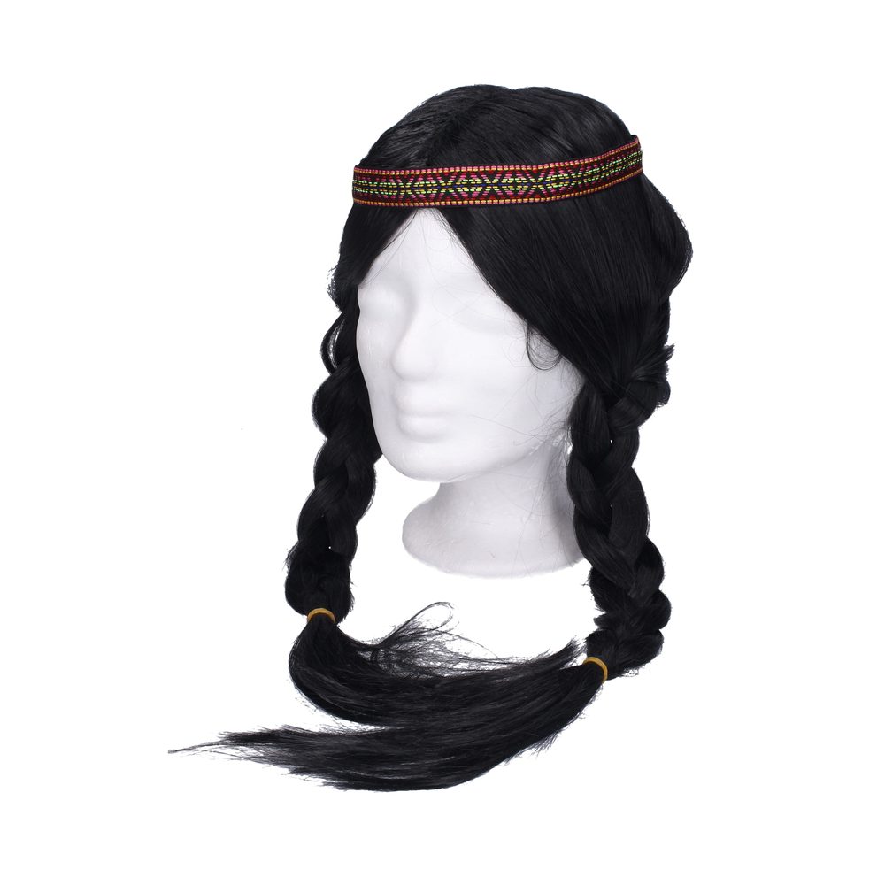 Černá paruka s copánky a indiánskou čelenkou Černá paruka se zapletenými copánky a čelenkou bude skvělým doplňkem ke kostýmu indiána na karnevalovou párty!