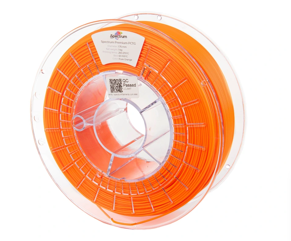 Filament Premium PCTG od značky Spectrum je vynikající alternativou k PET-G, který je ve světě 3D tisku dobře známý. Filament PCTG patří do stejné skupiny kopolyesterů a nabízí podobně snadný tisk jako PETG. Pro tisk není nutná vyhřívaná komora. Velmi důležitou výhodou filamentu Premium PCTG je jeho zvýšená rázová pevnost, vysoká rozměrová stabilita a nízké smrštění. Filament Spectrum Premium PCTG v sobě spojuje nejžádanější vlastnosti materiálů Tough PLA a PET-G. Materiál PCTG má teplotu tepelného ohybu 76 °C, stejně jako vynikající tiskový povrch a vyšší pružnost. Mezi další výhody patří vysoká chemická odolnost tištěných modelů. Prvky vyrobené s použitím transparentních barev Spectrum Premium PCTG mají vyšší průhlednost než jejich protějšky vyrobené s použitím PET-G. To znamená, že je možné dosáhnout efektu blízkého průhlednosti s malým množstvím vnějších kontur. Technické údaje: Materiál: PCTG Dostupný průměr: 1,75 / 2,85 mm Tolerance průměru: +/- 0,03 mm Hustota: 1,27 g/cm3 Tepelná odolnost: HDT B - 76 °C Povrchová úprava: lesklá Doporučení pro tisk: Teplota trysky: 250-270 °C Teplota podložky: 60-100 °C Doporučená rychlost tisku: 40-110 mm/s Doporučená výška vrstvy: 0,05 - 0,30 mm Chlazení: 75-100%
