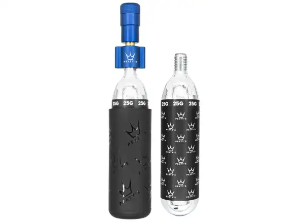 Peaty’s Holeshot CO2 sada obsahuje hlavici a dvě 25g CO2 bombičky. Hlavice je vyrobena z CNC opracované hliníkové slitity 6061 a má anodizovaný povrch. Unikátní tvar hlavice zaručuje rychlou a pohodlnou aplikaci. Silikonový návlek na bombičku s uzavřeným dnem chrání při aplikaci ruce před omrznutím. Pro nahuštění stačí pouze narazit na ventilek a stlačit. Kompatibilní pouze s galuskovým ventilkem.