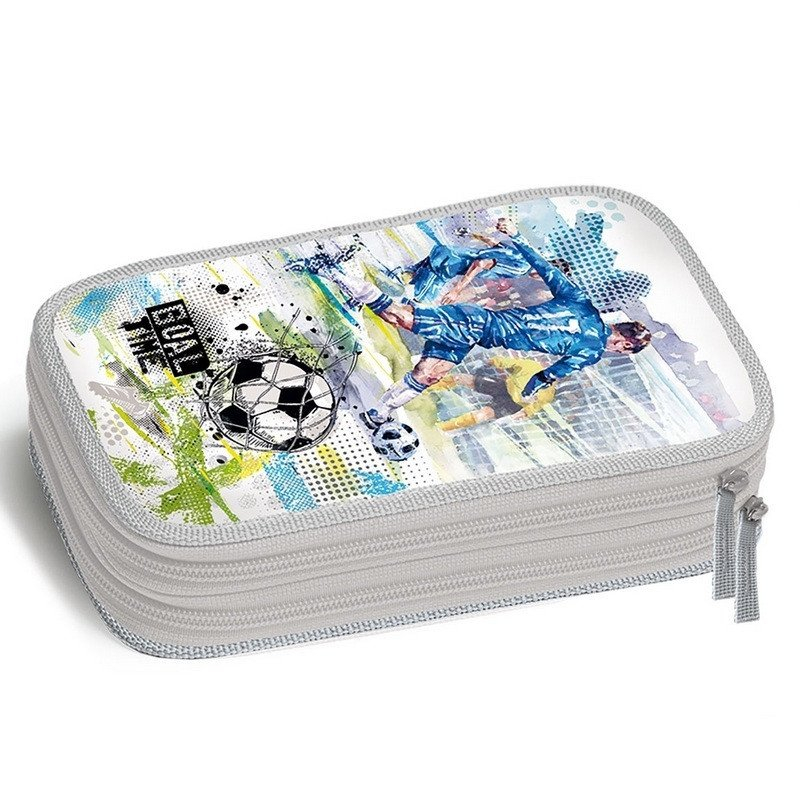 Dvoupatrový školní pouzdro GOAL TIME. • penál nabízí dva úložné prostory pro úschovu psacích potřeb a dalších školních pomůcek • uzavírání obou pater je pomocí zipu s poutky pro lepší manipulaci • v první komoře se nacházejí gumičky na pravítko, ořezávátko, gumu a poutka pro 10 pastelek • v druhé najdete 10 poutek na pera, fixy, pastelky, propisky a jiné potřeby • v druhé komoře najdete vložený rozvrh hodin s obrázkem pod fólií, kde mohou být uloženy i jiné odkazy a lístečky • pod rozvrhem jsou ještě 2 poutka z gumiček • penál je bez výbavy