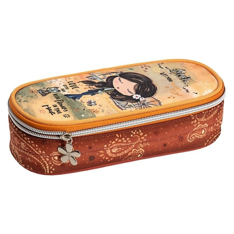 Praktický a prostorný oválný penál z dílny španělské návrhářky s motivem děvčátka Anekke. • je vybaven vnitřní kapsou na zip a rozvrhem hodin, který je vložen pod fólií na klopě • ta odděluje horní část penálu a má na sobě gumičky pro uchycení potřeb na psaní • každý zip je ukončen ozdobou s designem Anekke