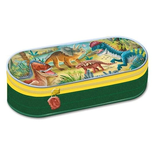 Praktický a prostorný oválný penál Jurassic ADVENTURE. br br• je vybaven vnitřní kapsou na zip a rozvrhem hodin, který je vložen pod fólií na klopě br• ta odděluje horní část penálu a má na sobě gumičky pro uchycení potřeb na psaní br• každý zip je ukončen ozdobou