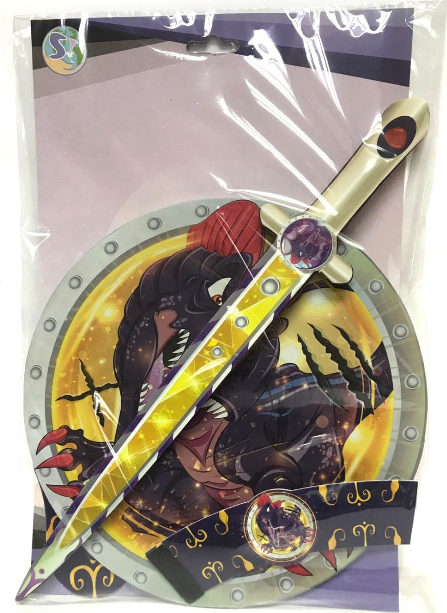 „Dětský pěnový meč a štít s motivem D-Rexe pro malého samuraje. Souprava je vyrobena z pěny a je velmi bezpečná. Vhodné jako doplněk ke karnevalovému kostýmu.“