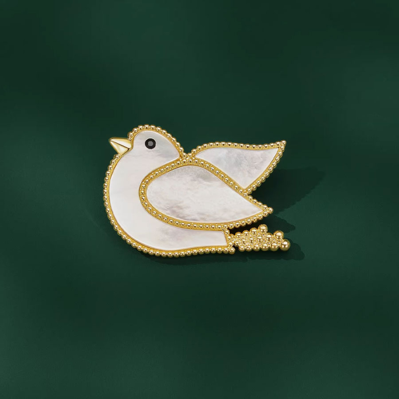 Tato drobná luxusní brož ve tvaru holubice působí klidně, čistě a mimořádně kultivovaně. Perleťové tělo lemované jemným zlatým orámováním vytváří harmonický celek, který zaujme svou lehkostí i symbolickým významem. Holubice je zde ztvárněna v minimalistické, elegantní podobě, která nepodléhá trendům.Precizní zpracování a drobné zlaté kuličky po obvodu dodávají broži jemný šperkařský charakter a pocit ruční práce. Díky perleti získává šperk měkký, přirozený lesk, který krásně reaguje na světlo a dodává celému motivu živost a hloubku.Díky své subtilní velikosti je brož velmi univerzální a snadno nositelná. Vynikne na klopě saka, kabátu, šatech i jemném úpletu a hodí se jak pro každodenní nošení, tak pro slavnostnější a symbolické příležitosti. 💡 Tip: Brož s motivem holubice se skvěle hodí na klopu elegantního saka nebo kabátu – dodá outfitu jemný významový akcent bez okázalosti.
