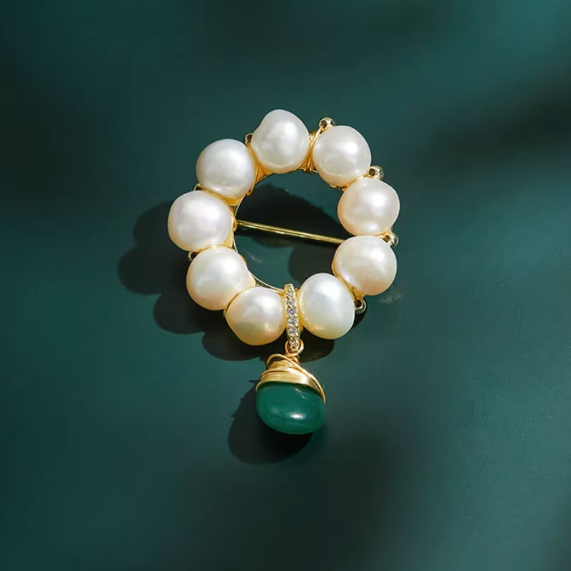 Tato mimořádná brož v sobě snoubí jemnost pravých perel a surovou energii zeleného minerálu v jedinečném designu kruhového věnce. Precizní šperkařské zpracování zvýrazňuje kontrast mezi měkkým perleťovým leskem a strukturovaným závěsem s výraznou kapkou, která tvoří stylový středobod celého šperku.Každá perla byla pečlivě zasazena do zlacené konstrukce tak, aby vznikl harmonický celek – působivý a zároveň dokonale vyvážený. Závěsný kámen oživuje kompozici odstínem hluboké zeleně, obtočený dekorativním drátem a doplněný jemnými čirými zirkony, které přinášejí další světelné odlesky.Brož zaujme svou elegancí a osobitostí. Ať už ji připnete na jednoduché šaty, vlněný kabát nebo sako, okamžitě dodá vašemu outfitu noblesu. Je to šperk, který se neokouká – s nadčasovým šarmem a uměleckým rukopisem. 💡 Tip: Doporučujeme jako luxusní dárek pro maminku, partnerku nebo důležitou kolegyni – brož v sobě nese eleganci, sílu i symboliku ochrany.