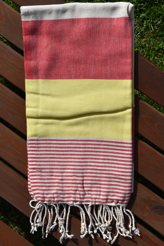 Peshtemal osušky pocházejí z Turecka a jsou vyráběny ručním tkaním na tkalcovských stavechOsušky jsou vyrobeny ze 100 % bavlny a rozměr je 95x175 cm, váha osušky je 280gOsušky Peshtemal jsou velmi savé a rychle schnoucíOsuška je s pruhovaným vzorem červené, bílé a žluté barvy a na jejím konci jsou ručně vázané třásněOsušky Peshtemal se od nepaměti využívají v tradičních tureckých lázních Hammam k zakrytí intimních částí těla Jejich využití je však mnohem širší, lze je totiž využít jako ubrus, přehoz na pohovku či na postel, jako piknikovou deku, nebo jako pareoOsušky jsou velmi lehké, skladné, snadno se suší a jsou tak vhodné pro cestování, neboť nezabírají mnoho místa Prvním praním se vlákna zatáhnou a struktura osušky se zpevní, zlepší se i její savostDoporučené praní je na 30°C, nepoužívat avivážNepoužívejte prací prostředky s obsahem bělících a rozjasňujících substancíOdstřeďujte při nižších otáčkách, aby nedošlo k polámání bavlněných vláken, a tak k jejich trvalému poškození Odstíny barev obrázků se mohou barevně lišit, v závislosti na nastavení vašeho monitoru