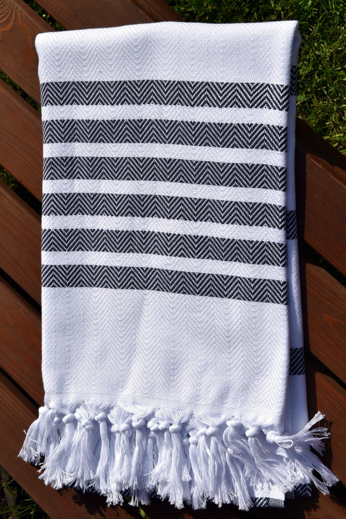 Peshtemal osušky pocházejí z Turecka a jsou vyráběny ručním tkaním na tkalcovských stavechOsušky jsou vyrobeny ze 100 % bavlny a rozměr je 100x170 cm, váha osušky je 400gOsušky Peshtemal jsou velmi savé a rychle schnoucíBílou osušku lemují černé pásy a na jejím konci jsou ručně vázané třásněOsušky Peshtemal se od nepaměti využívají v tradičních tureckých lázních Hammam k zakrytí intimních částí těla Jejich využití je však mnohem širší, lze je totiž využít jako ubrus, přehoz na pohovku či na postel, jako piknikovou deku, nebo jako pareoOsušky jsou velmi lehké, skladné, snadno se suší a jsou tak vhodné pro cestování, neboť nezabírají mnoho místa Prvním praním se vlákna zatáhnou a struktura osušky se zpevní, zlepší se i její savostDoporučené praní je na 30°C, nepoužívat avivážNepoužívejte prací prostředky s obsahem bělících a rozjasňujících substancíOdstřeďujte při nižších otáčkách, aby nedošlo k polámání bavlněných vláken, a tak k jejich trvalému poškození Odstíny barev obrázků se mohou barevně lišit, v závislosti na nastavení vašeho monitoru
