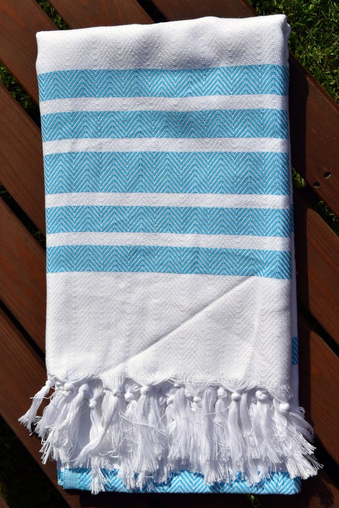Peshtemal osušky pocházejí z Turecka a jsou vyráběny ručním tkaním na tkalcovských stavechOsušky jsou vyrobeny ze 100 % bavlny a rozměr je 100x170 cm, váha osušky je 400gOsušky Peshtemal jsou velmi savé a rychle schnoucíBílou osušku lemují tyrkysově modré pásy a na jejím konci jsou ručně vázané třásněOsušky Peshtemal se od nepaměti využívají v tradičních tureckých lázních Hammam k zakrytí intimních částí těla Jejich využití je však mnohem širší, lze je totiž využít jako ubrus, přehoz na pohovku či na postel, jako piknikovou deku, nebo jako pareoOsušky jsou velmi lehké, skladné, snadno se suší a jsou tak vhodné pro cestování, neboť nezabírají mnoho místa Prvním praním se vlákna zatáhnou a struktura osušky se zpevní, zlepší se i její savostDoporučené praní je na 30°C, nepoužívat avivážNepoužívejte prací prostředky s obsahem bělících a rozjasňujících substancíOdstřeďujte při nižších otáčkách, aby nedošlo k polámání bavlněných vláken, a tak k jejich trvalému poškození Odstíny barev obrázků se mohou barevně lišit v závislosti na nastavení vašeho monitoru