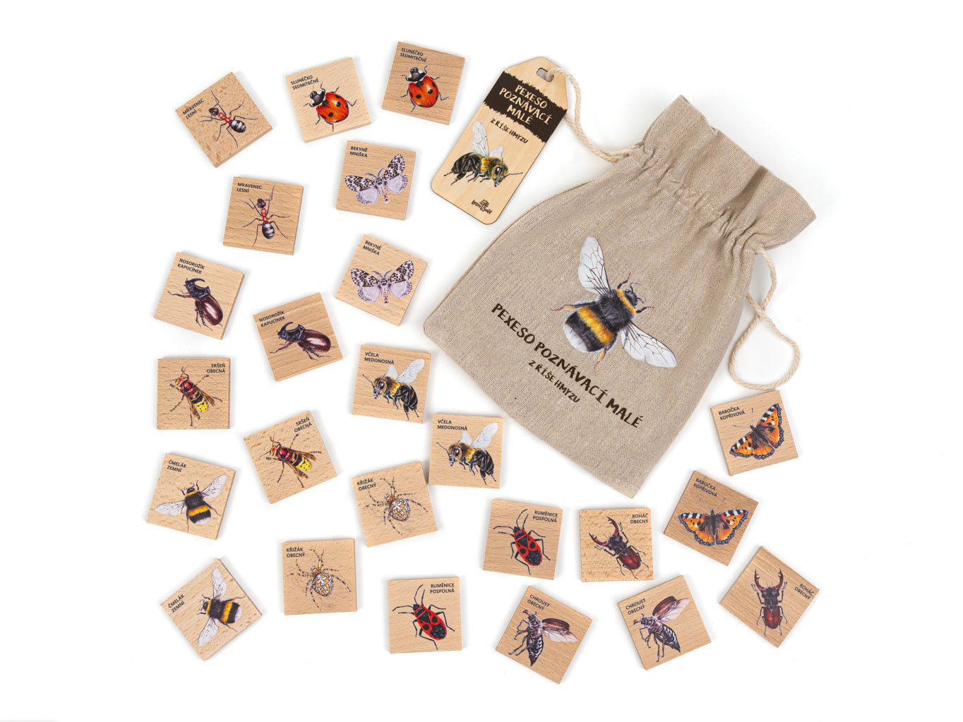 Pexeso vyrábí u nás v dílně české ruce z kvalitního českého certifikovaného dřeva. Balení obsahuje 24 dílků z masivu o velikosti 4,5 × 4,5 × 0,7 cm s jednostranným potiskem. Zabaleno v přírodním látkovém pytlíku. Autorem kreseb jsou čeští ilustrátoři, obrázky jsou chráněny autorskými právy. Pexeso zábavnou a hravou formou seznamuje děti i dospělé s přírodou. Obrázky hledaných dvojic jsou stejné. Druhy hmyzu: nosorožík, čmelák, včela, křižák, slunéčko, mravenec, roháč, bekyně mniška, sršeň, babočka kopřivová, chroust, ruměnice. Lesní svět = značka s ekologickým certifikátem udržitelného hospodářství PEFC. Všechny výrobky jsou vyrobeny s ohledem na životní prostředí.