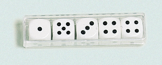 Sada 5 kusů klasických bílých kostek s černým zobrazením počtu na každé straně. K těmto kostkám je příhodný hrací kožený kelímek, nabízený jako další samostatný produkt.