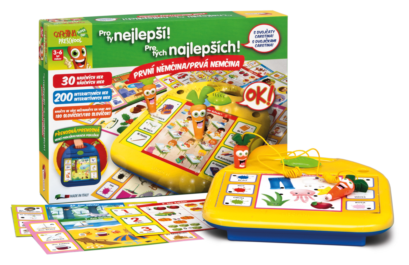 Pro ty nejlepší! Zábavná elektronická naučná hra. Dvojčata CAROTINA vydávají při každé správné kombinaci veselé zvuky! Tato naučná hra z řady naučných her CAROTINA zahrnuje více než 200 na sebe navazujících her a je určená pro děti od tří let. Nauč se hravou formou abecedu, čísla, barvy a spoustu dalšího – a to vše v NĚMČINĚ! Hrací podložka je přenosná a je opatřena úchyty pro dvojčata CAROTINA a pracovní listy (na zadní straně podložky je možné pracovní listy uschovávat).