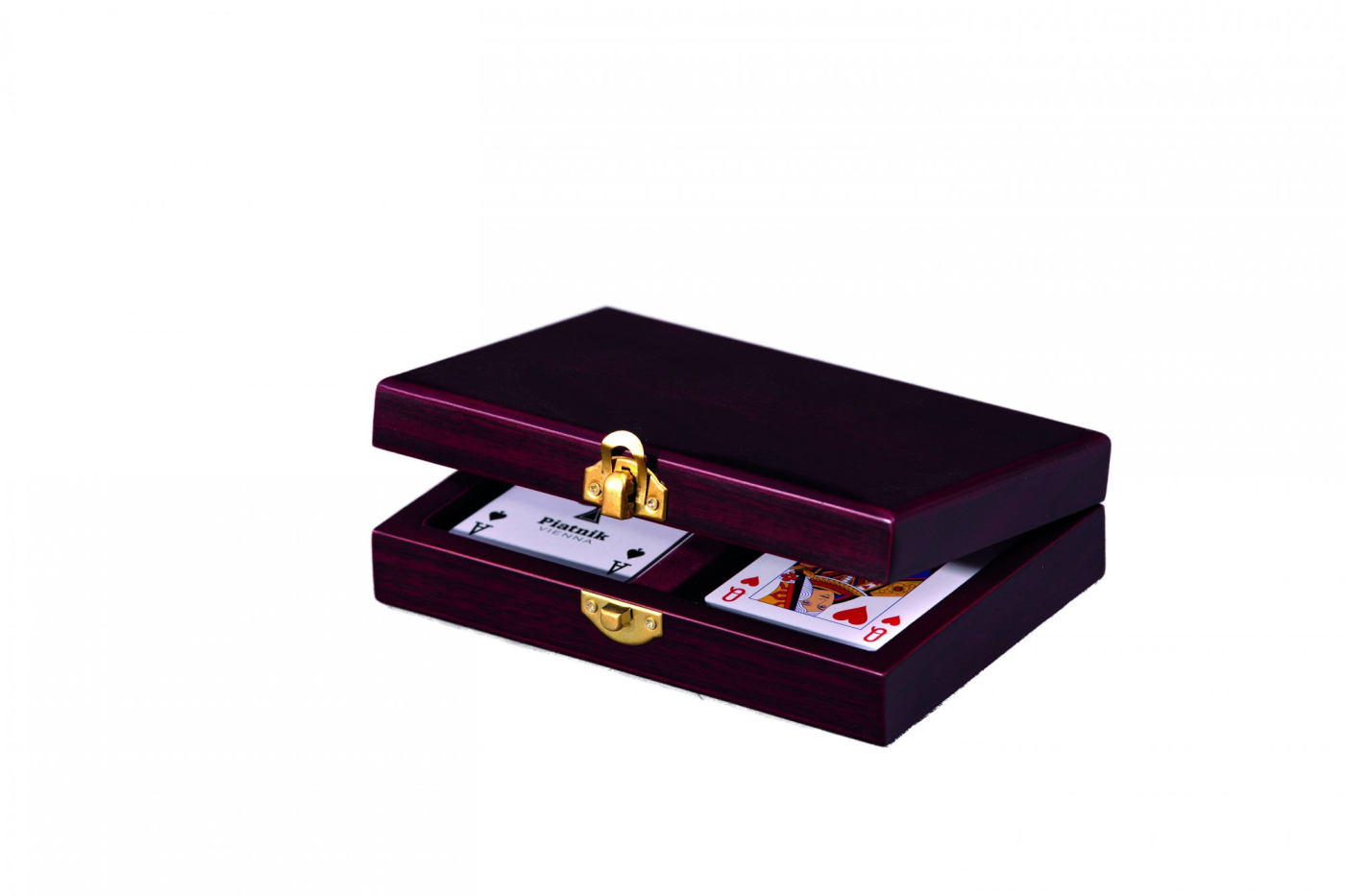 Dřevěná kazeta na hrací karty od firmy Piatnik, vhodná na kanastu. Neobsahuje hrací karty. Rozměry kazety: cca 17 x 11,5 x 4,5 cm. Vnitřní prostor na karty (2x) 9,6 x 6,9 x 2,1 cm.