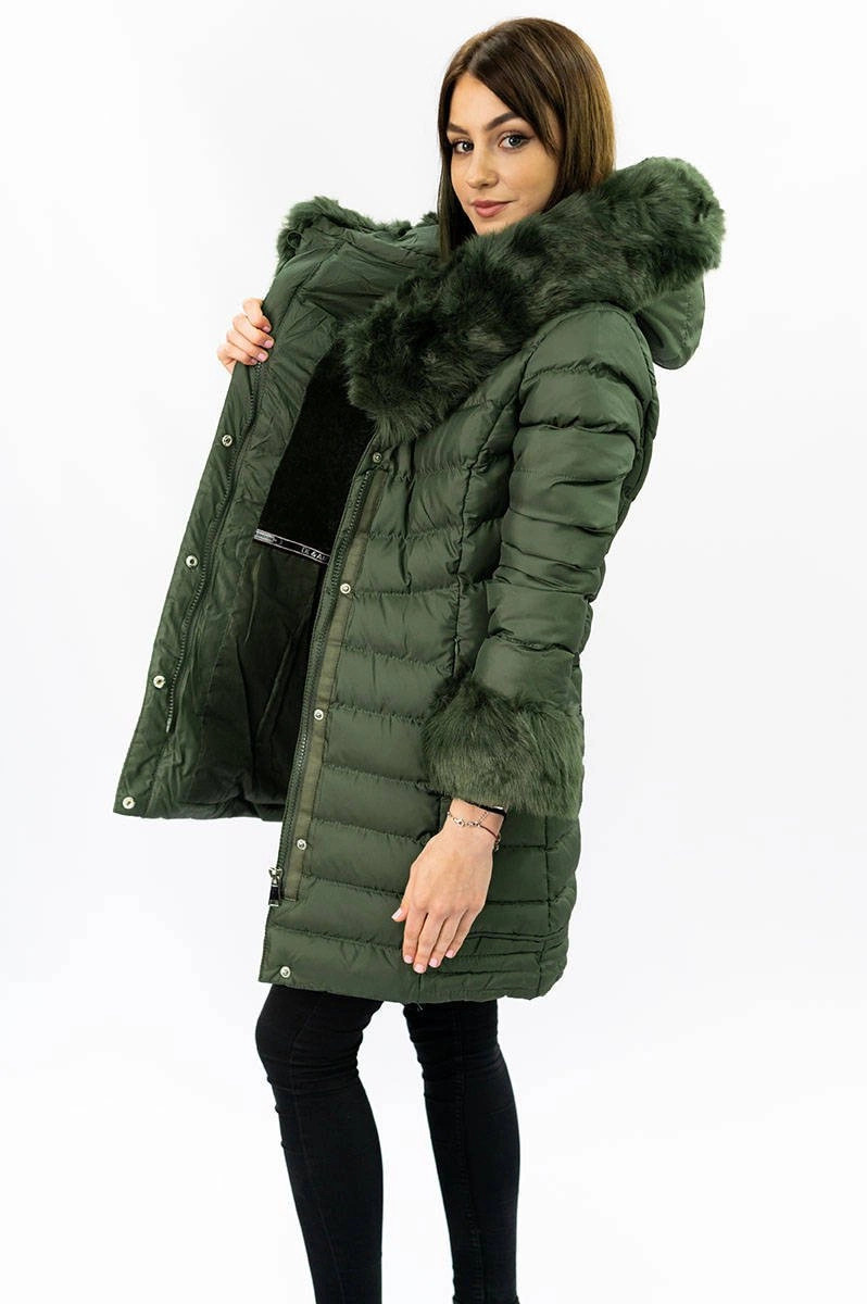 Věnujte prosím pozornost při výběru velikosti dle velikostní tabulky uvedené níže. Velikosti neodpovídají běžně nošené konfekci. Velmi teplá delší zimní bunda s kapucí Bunda je lehce vypasovaná, je zateplená syntetickou péřovou výplní a navíc je uvnitř zateplená mechovitou kožešinou a má dvě kapsy a jednu vnitřní kapsu. Model má kapuci olemovanou kožešinou. Zatímco kapuci je možné odepnout, kožešinu odepnout nelze. Na koncích rukávů jsou skryté stahovací lemy a také kožešiny, které je možné odepnout. Složení: vrchní vrstva - 100 % polyester, podšívka - 100 % polyester.