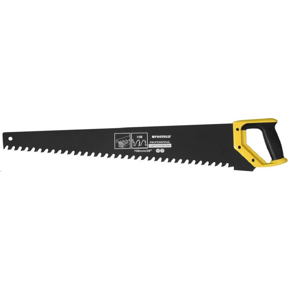 Pila ocaska na porobeton 33 zubů HM 700 mm PROTECO 10.82-0334 Pila ocaska na pórobeton PROTECO 10.82-0334 je speciální ruční pila určená pro řezání pórobetonových bloků, izolačních desek a dalších podobných stavebních materiálů. Hlavní vlastnosti: Délka: 700 mm Počet zubů: 33 zubů (17 zubů s plátky ze slinutého karbidu) Materiál zubů: HM (slinutý karbid) Značka: PROTECO Označení: 10.82-0334 Použití: Řezání pórobetonových tvárnic (Ytong, Porfix apod.) Řezání izolačních desek Řezání dalších stavebních materiálů s podobnými vlastnostmi Použití: Pila je navržena pro efektivní a přesné řezání pórobetonu a podobných materiálů. Díky zubům z HM (slinutého karbidu) má pila dlouhou životnost a vysokou odolnost proti opotřebení. Pila je osazena ergonomicky tvarovanou rukojetí z kvalitního ABS plastu s pryžovými prvky, zajišťující bezpečný úchop. List o šíři 1,6 mm se střídavými zuby s plátky ze slinutých karbidů zajišťuje kvalitní a dlouhotrvající řezný výkon