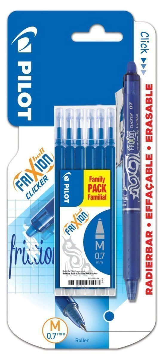 Napiš ... Vygumuj ... A přepiš s rollerem FriXion se stiskacím mechanismem! Vygumujte beze zbytků pomocí tepla, které vzniká třením gumovacího hrotu FriXion o papír, a který nezanechává žádné zbytky. Použijte stejné pero (inkoust) pro psaní a přepsání. Blistr obsahuje 6ks modré. Šíře stopy 0,7mm