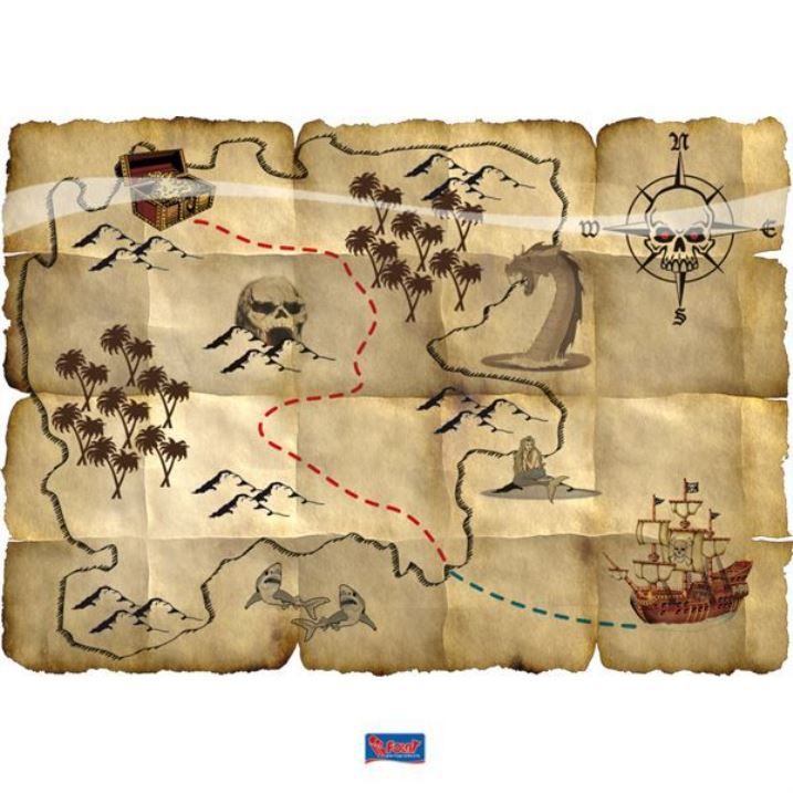 Pirátská mapa k pokladu je perfektní rekvizitou pro všechny malé i velké dobrodruhy. V balení najdeš 4 svinuté mapy o rozměru 21 × 29 cm, každou elegantně převázanou červenou stužkou – připravenou rovnou na výpravu! Skvělá volba na dětské oslavy, karnevaly nebo tematické večírky.