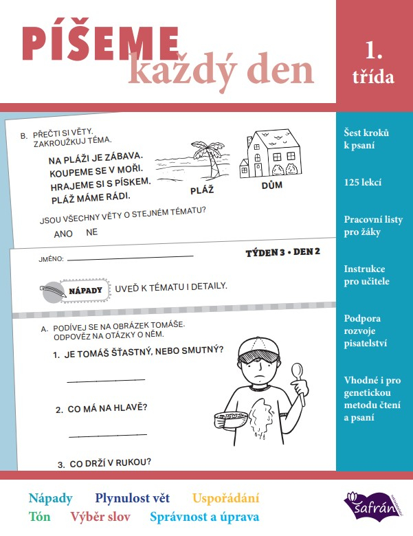V této publikaci najdete návod, jak žáky postupně naučit psát jednoduché texty. Seznámíte je se šesti aspekty, které by měli při psaní zohledňovat. Pro pět z nich najdete v rukověti úkoly na pět týdnů. Žáci se učí hledat zajímavé téma a použít při psaní různé detaily, psát texty, které mají začátek, prostředek a konec, používat vhodná slova (slovesa, jména), propojovat nápady do delších vět a zohledňovat náladu či tón, který v textu chtějí mít. Nabízená témata a náročnost úkolů odpovídají úrovni 1. i 2. třídy. Nabízené náměty se týkají života ve škole i doma, hraček či zvířat, kamarádů, učitelů i rodičů. Děti zkoušejí psát o pocitech a vystihnout co nejlépe náladu. V průběhu celého roku mohou nenásilně zapojovat znalosti pravopisu a správné úpravy, které jsou jim v pracovních listech připomínány. Žáci si postupně vybudují sebedůvěru a dovednosti, které jim pomohou psát autentické texty.