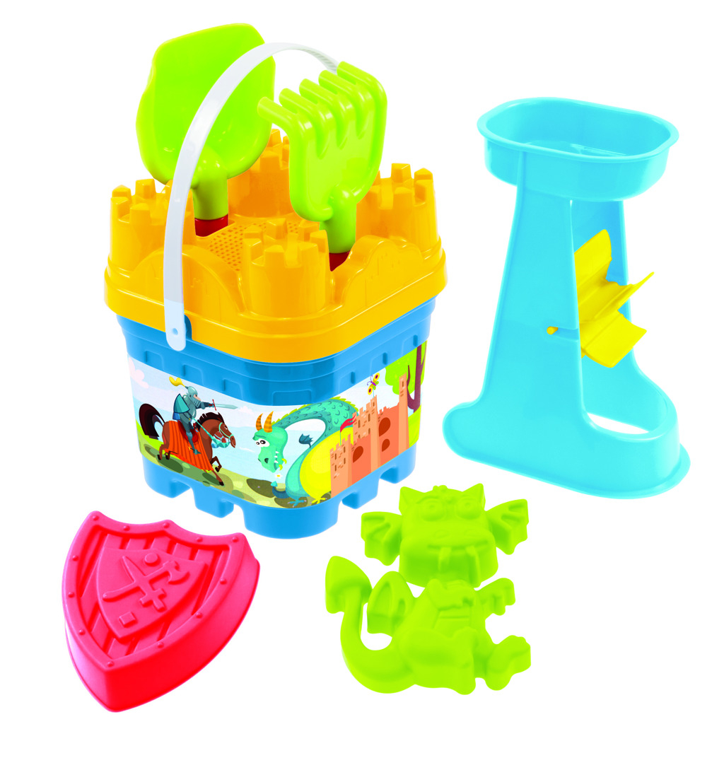 Písková sada Hrad IML. Sada obsahuje kyblík, hrabičky,lopatku, sítko, tři tématické bábovky, vodní mlýnek. Vyrobeno v EU z kvalitního plastu.