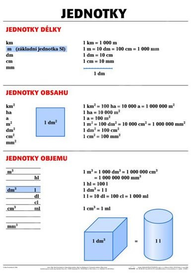 Nástěnná výuková tabule vhodná k výuce matematiky. Zobrazuje přehled základní a odvozených jednotek délky, obsahu a objemu a vztahu mezi nimi.Výuková tabule k výuce matematiky a fyziky na ZŠ a všech typech SŠ.Přehled jednotek, aktualizace (zařazení) podle normy z 14.7.2000.
