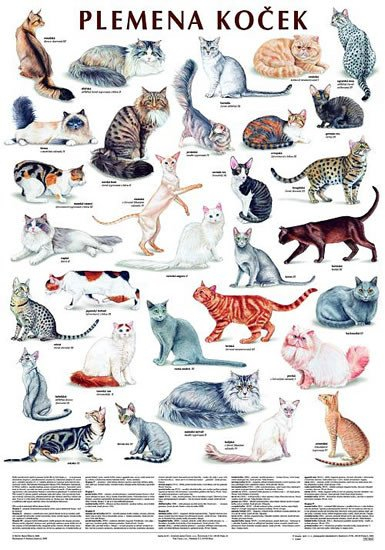 Mezinárodní felinologická federace (FIFe) v současné době uznává 31 plemen koček, jejichž standardní vyobrazení pečlivě korigovala dr. Marie Říhová. Zařazení do jednotlivých skupin a podrobnější údaje v textu. Ilustrovala Barbora Dančová. 67x96 cm, tabule plakát