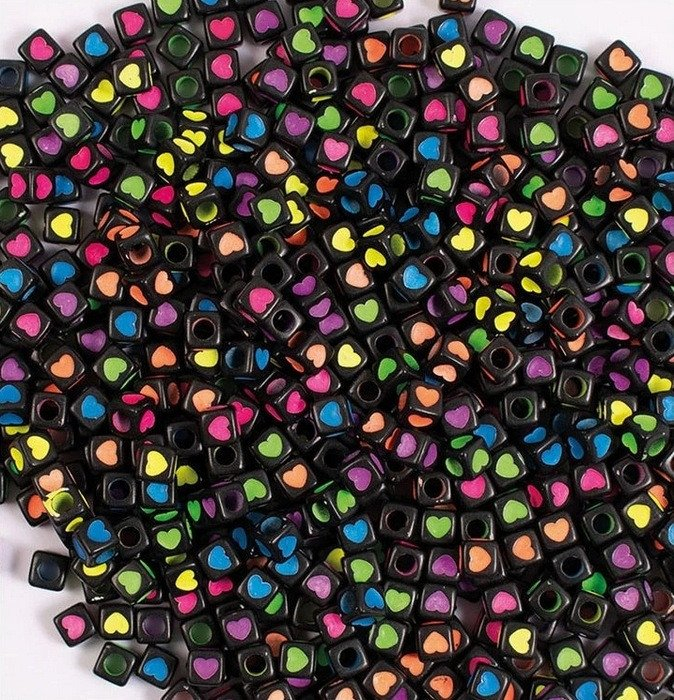 Plastové korálky srdíčka v kombinaci černé a výrazných neonových barev oživí každý kreativní projekt. Čtvercové korálky s motivem srdce jsou ideální pro výrobu náramků, náhrdelníků, přívěsků i originálních doplňků. Skvěle se kombinují s písmenkovými korálky a dalšími tvary, díky čemuž vytvoříte osobní šperky na míru. Balení obsahuje 300 ks korálků připravených k okamžitému tvoření.