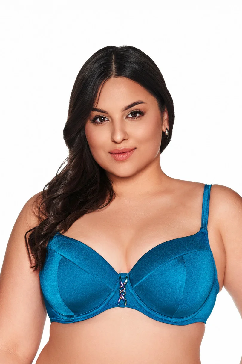 Odkryj szyk i elegancję z naszym biustonoszem kąpielowym w głębokim kolorze azuru, który przywodzi na myśl piękno błękitnej laguny. Ten niezwykle stylowy biustonosz został zaprojektowany, aby zapewnić idealne podtrzymanie i doskonały wygląd. Usztywnione miseczki precyzyjnie zbierają piersi do środka, tworząc oszałamiający dekolt, który przyciąga spojrzenia. Unikalnym akcentem jest szeroka ozdoba w kolorze hologramu umieszczona między miseczkami, dodająca biustonoszowi wyjątkowego charakteru. Dzięki niej, biustonosz nabiera niepowtarzalnego blasku, wyróżniając się spośród innych. To połączenie klasycznego piękna z nowoczesnym detalem sprawia, że nasz biustonosz kąpielowy stanie się Twoim ulubionym elementem letniej garderoby.