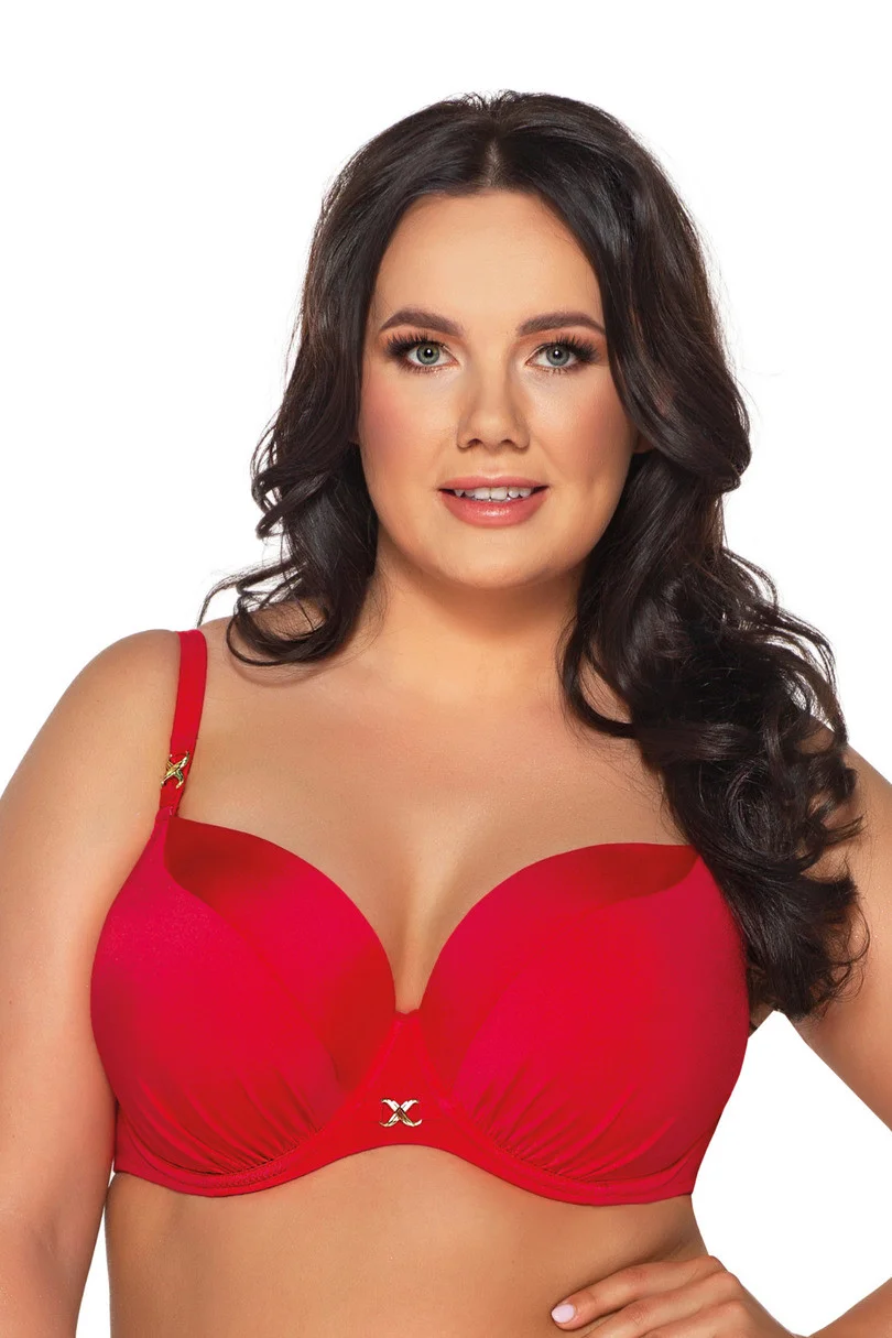 Energetyczna czerwień idealnie współgra z letnią opalenizną! Dzianina ze skrzącym połyskiem wzbogacona o złote dodatki podkreśli koloryt skóry i rozświetli plażowy outfit. Pełne miski biustonosza full cup solidnie zbiorą i podtrzymają nawet najbardziej niesforny biust, a delikatne marszczenia dodatkowo wizualnie zaokrąglą biust. Do kompletu dobierz koniecznie wielofunkcyjne figi kąpielowe SF 180/2 z regulującymi wysokość boczków troczkami. Skład: 80% poliamid, 20% elastan.