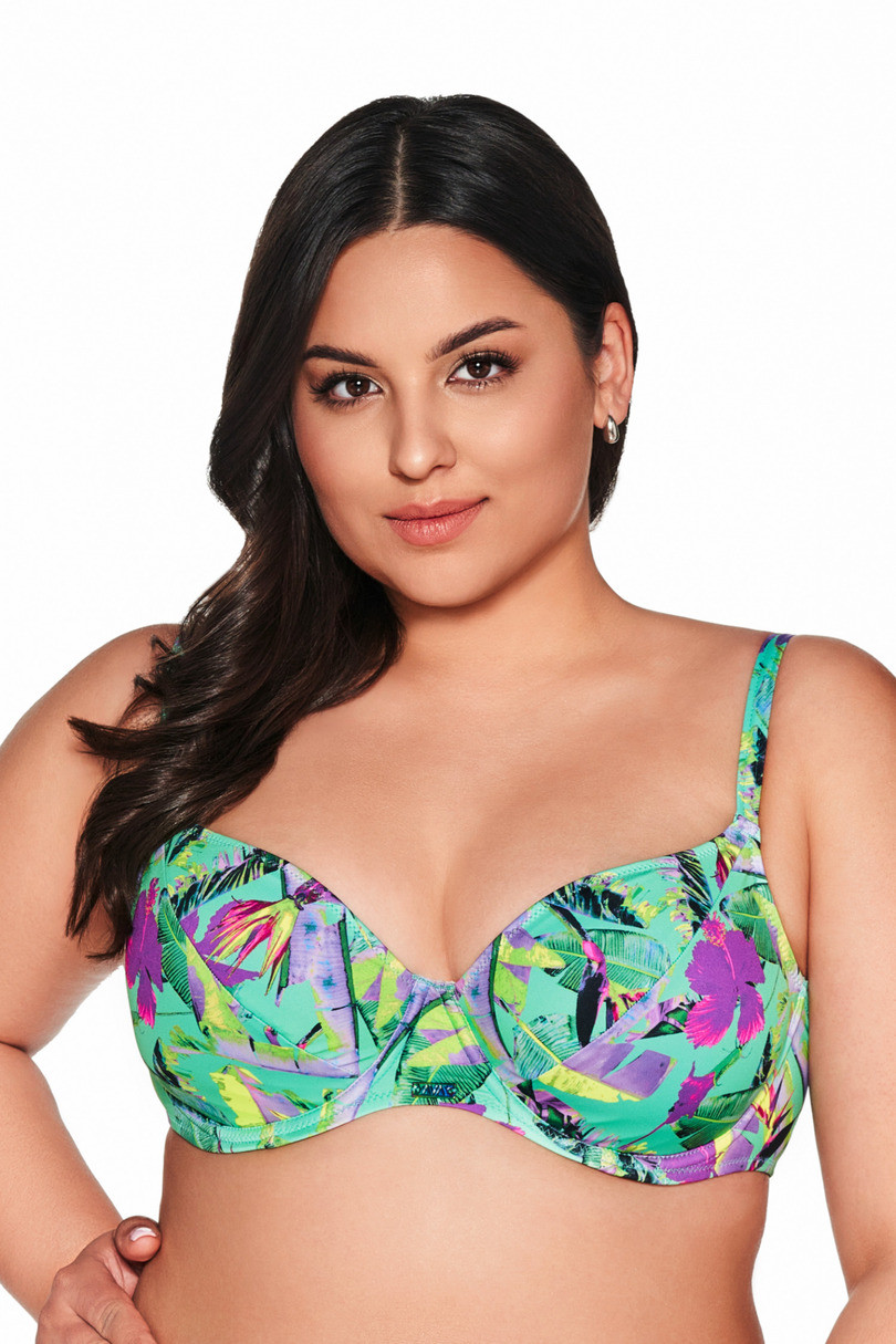 211 SOFT - Zieleń, fiolet i motyw natury: Biustonosz kąpielowy SOFT to połączenie zielonego i fioletowego, które wyróżni Cię z tłumu. Wyrazisty print z liśćmi i kwiatami nadaje mu oryginalności i szyku. Komfortowa konstrukcja miseczek zapewnia miękki, elastyczny materiał, który idealnie podtrzymuje i eksponuje biust. Regulowane ramiączka i ozdobne zapięcie na plecach dodają elegancji. Skład: 80% Poliamid, 20% Elastan.