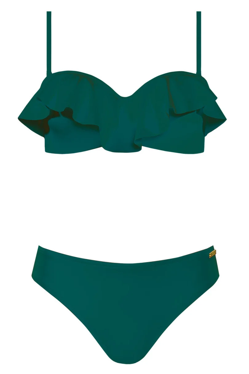 Dvojdílné plavky. Vyztužená podprsenka zdobená volánkem na zádech, s nastavitelnými odnímatelnými ramínky. S hladkými vykrojenými kalhotkami. Složení: 78 % polyamid, 22 % elastan