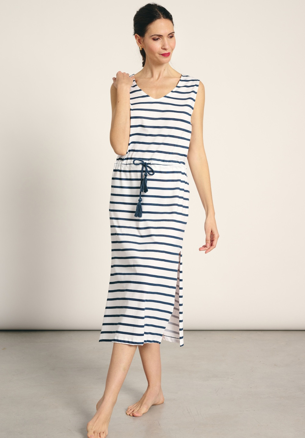 Dámské plážové šaty značky Muydemi. Šaty jsou vyrobeny z jemné bavlny, ideální pro horké letní dny. Šaty jsou volné, jednoduchého střihu s délkou pod kolena. Výstřih je do tvaru V. Šaty mají široké ramínka a na bocích mají rozparky. Šaty mají okrasnou šňůrku v pase, kterou lze šaty stáhnout. Materiálové složení: 95% bavlna, 5% elastan