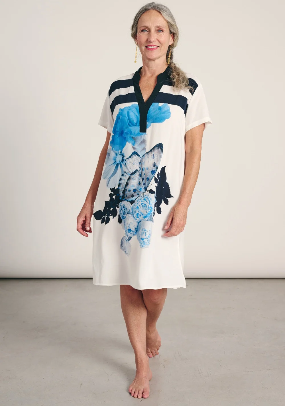 Dámské plážové šaty značky Muydemi. Šaty jsou vyrobeny ze 100% viskózy, ideální pro horké letní dny. Šaty jsou volné, jednoduchého střihu, s délkou nad kolena. Šaty mají krátký rukáv a výstřih do V. Materiálové složení: 100% viskóza.