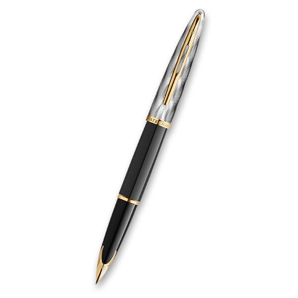 Plnicí pero Waterman Reflections of Paris SE DLX Black GT s černě lakovaným mosazným tělem. Víčko s vlnkovou reliéfní rytinou vyvedenou leptáním a pokovené palladiem. V kombinaci s pozlacenými doplňky. Hrot z 18karátového zlata (ryzost Au 750/1000) se zdobnou rytinou. Plnicí pero:, nasazovací víčko, precizně leštěný 18karátový zlatý hrot (ryzost Au 750/1000), možnost použití jak inkoustových bombiček, tak i plnění z lahvičkového inkoustu, Dodáváno s bombičkou, v dárkové krabičce Speciální edice Reflections of Paris v jednotném provedení Deluxe Black je k dispozici ve čtyřech kolekcích značky – Exception, Carene, Expert a Hémisphere. Kolekce je inspirována, duchem a romantikou noční Paříže a vlnami řeky Seiny, která městem protéká. Každý model čerpá ze 140letého řemeslného mistrovství značky Waterman a každý kus je ve Francii, pečlivě ručně sestaven. Kouzlo kolekce Carene DeLuxe vychází z jejích čistých a plynulých tvarů zkombinovaných s uchvacujícími povrchovými úpravami využívajícími intenzitu, ušlechtilých kovů a subtilnost propracovaných rytin. Kolekce Carene DeLuxe je doslova magnetická. JAK SE LIŠÍ HROTY M A F? F - Slabý hrot (Fine) - Vhodný pro běžné psaní a poznámky. Mírný tlak vytváří jemnou linku. Velmi oblíbený, vhodný pro uživatele se standardním rukopisem., M - Střední hrot (Medium) - Průměrný tlak a šíře linky. Vhodný pro uživatele, kteří mají rádi maličko silnější linku., Zakupte produkt Plnicí pero Waterman Carène Reflections of Paris SE DLX Black GT, hrot F z kategorie Psací potřeby | Značkové psací potřeby | Waterman | Plnící pera od výrobce WATERMAN za cenu 12809 Kč.