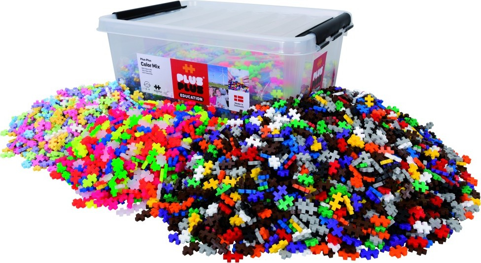 Praktický úložný box obsahuje celkem 6000 dílků Plus-Plus. Z toho 3600 dílků v základních barvách, 1200 dílků v neonových barvách a 1200 dílků v pastelových barvách. Součástí je i brožura s konkrétními zadáními a úkoly pro děti. Vyrobeno v Dánsku, bez ftalátů, recyklovaný plast, snadná údržba. Rozměr boxu 40×30×19 cm. Ideální pro kolektivy. Vhodné od 5 let.