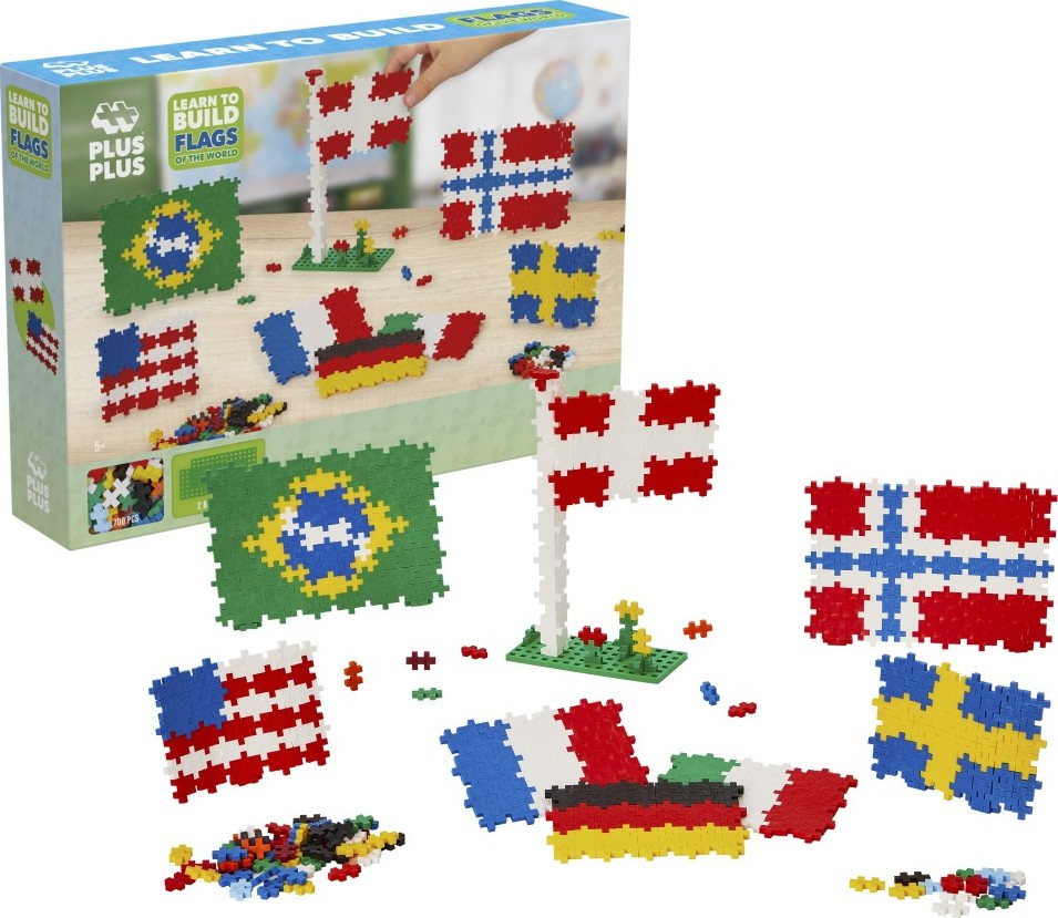 Kreativní sada PLUS-PLUS Nauč se stavět Vlajky světa obsahuje 700 dílků, ze kterých můžete podle podrobného návodu postavit spoustu vlajek různých států, ale i stožár, na který vlajku vyvěsíte. Součástí balení jsou 2 malé základní desky a šablony.