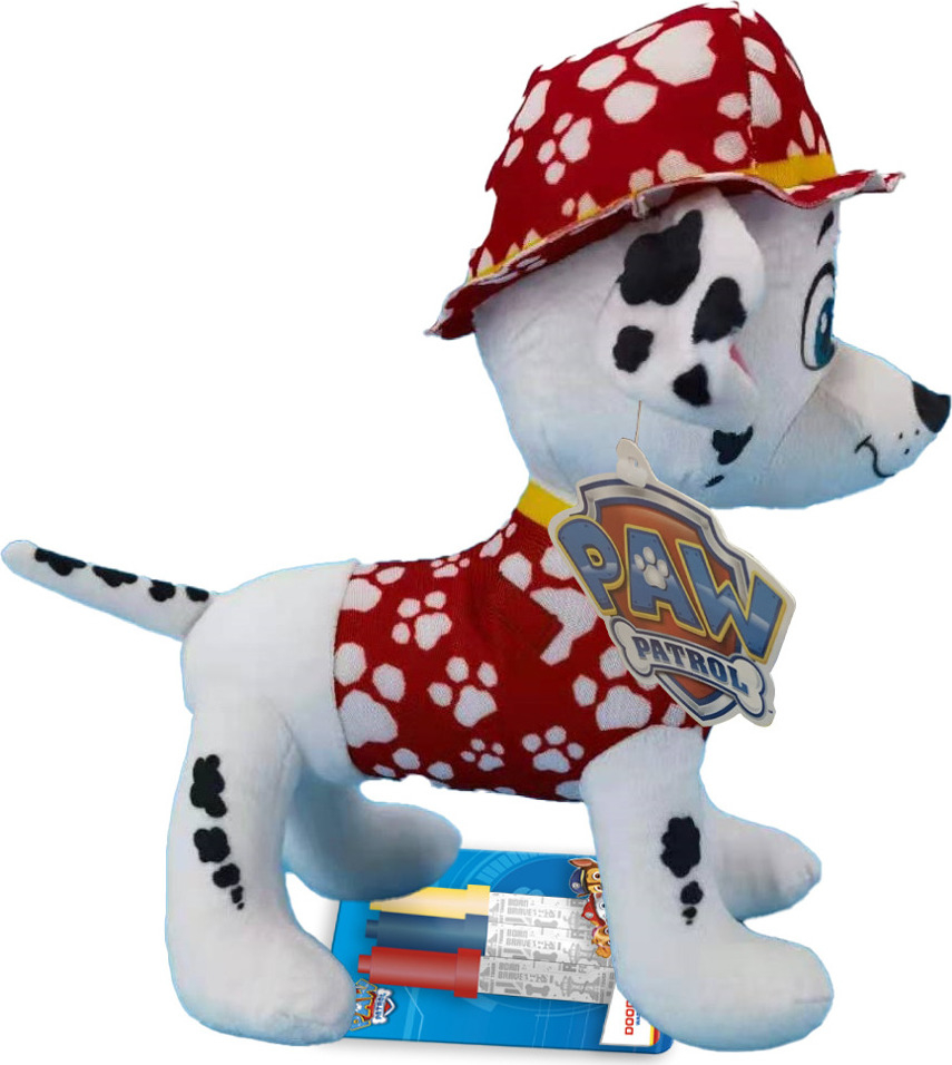 Plyšový firgurka Tlapková patrola – Skye, Chase a Marshall. Plyšák je oblečený v charakteristickém blečku a čepici (nelze sundat). Plyšák má obličej z hebkého plyše a tělo, hlavu a chodidla z materiálu, který lze pomalovat speciálními fixy na textil, které jsou sočástí balení (červená, modrá a žlutá). Velikost plyšáka 27 cm.